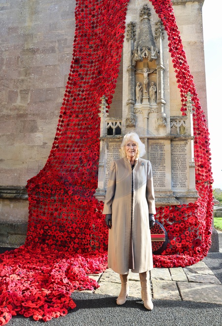CORSHAM, ENGLAND - OCTOBER 28: Queen Camilla smiles after she attached the final poppy to complete the cascade of 10,000 poppies draping the church tower at St. Bartholomew's Church during her visit to The Poppy Project on October 28, 2025 in Corsham, England. The Poppy Project has resulted in a display of crocheted and knitted poppies, which commemorates the 80th anniversary of the end of World War II., Credit:Chris Jackson / Avalon