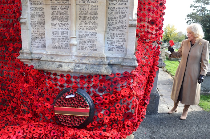 CORSHAM, ENGLAND - OCTOBER 28: Queen Camilla attaches the final poppy to complete the cascade of 10,000 poppies draping the church tower at St. Bartholomew's Church during her visit to The Poppy Project on October 28, 2025 in Corsham, England. The Poppy Project has resulted in a display of crocheted and knitted poppies, which commemorates the 80th anniversary of the end of World War II., Credit:Chris Jackson / Avalon