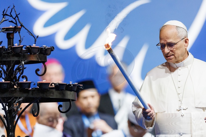 Pope Leo XIV and other religious leaders attend the closing ceremony of the International Meeting of Dialogue and Prayer for Peace of the Community of Sant'Egidio at the Colosseum, in Rome, Italy, 28 October 2025., Credit:Francesco Fotia / Avalon