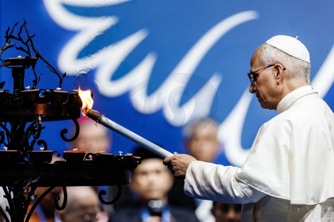Pope Leo XIV and other religious leaders attend the closing ceremony of the International Meeting of Dialogue and Prayer for Peace of the Community of Sant'Egidio at the Colosseum, in Rome, Italy, 28 October 2025., Credit:Francesco Fotia / Avalon