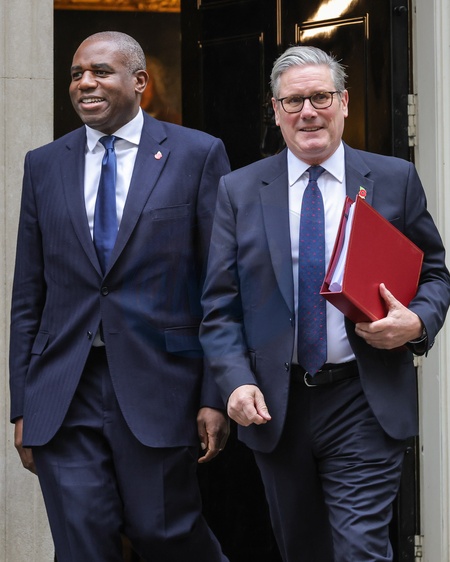 Prime Minister Sir Keir Starmer and Deputy Prime Minister David Lammy exit 10 Downing Street for PMQs, London, UK