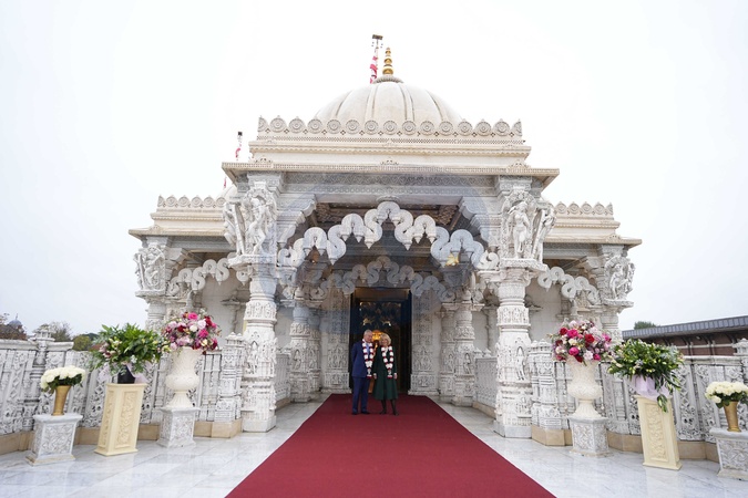 King Charles III and Queen Camilla pose for a photo, as they arrive for a visit to BAPS Shri Swaminarayan Mandir (known as the 'Neasden Temple') in Neasden, London. They will observe spiritual ceremonies, meet representatives from community and social impact initiatives the temple works with, before meeting members of the congregation. Picture date: Wednesday October 29, 2025., Credit:Aaron Chown / Avalon