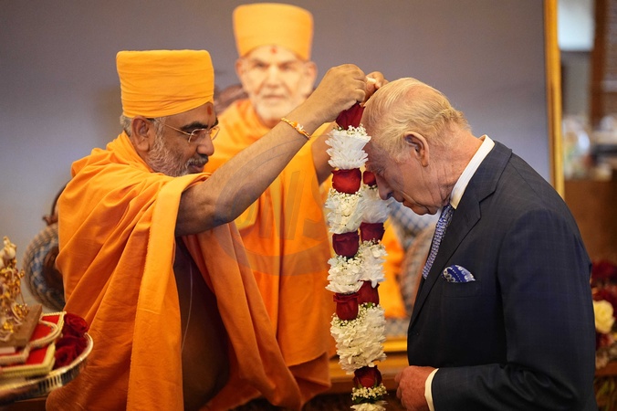 King Charles III receives a ceremonial welcome from the head priest of BAPS Shri Swaminarayan Mandir (known as the 'Neasden Temple') in Neasden, London. They will observe spiritual ceremonies, meet representatives from community and social impact initiatives the temple works with, before meeting members of the congregation. Picture date: Wednesday October 29, 2025., Credit:Aaron Chown / Avalon