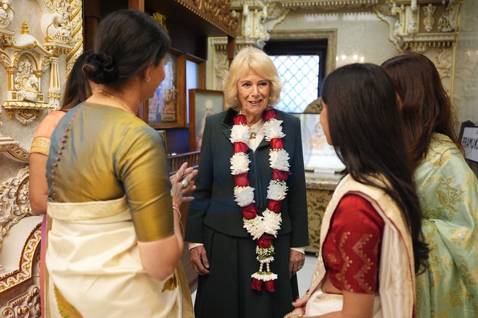 Queen Camilla meets members of the community, during a visit to BAPS Shri Swaminarayan Mandir (known as the 'Neasden Temple') in Neasden, London. They will observe spiritual ceremonies, meet representatives from community and social impact initiatives the temple works with, before meeting members of the congregation. Picture date: Wednesday October 29, 2025., Credit:Aaron Chown / Avalon
