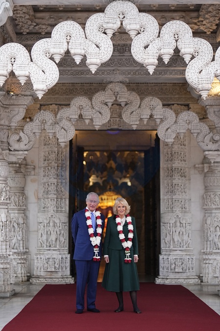 King Charles III and Queen Camilla pose for a photo, as they arrive for a visit to BAPS Shri Swaminarayan Mandir (known as the 'Neasden Temple') in Neasden, London. They will observe spiritual ceremonies, meet representatives from community and social impact initiatives the temple works with, before meeting members of the congregation. Picture date: Wednesday October 29, 2025., Credit:Aaron Chown / Avalon