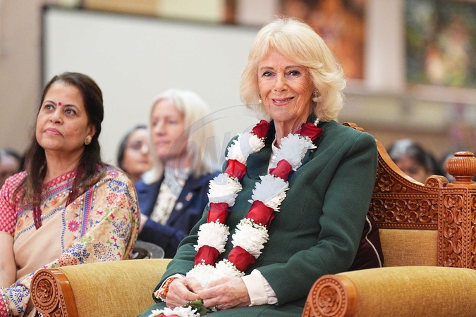 Queen Camilla smiles as her and King Charles III are greeted by children from the community, during a visit to BAPS Shri Swaminarayan Mandir (known as the 'Neasden Temple') in Neasden, London. They will observe spiritual ceremonies, meet representatives from community and social impact initiatives the temple works with, before meeting members of the congregation. Picture date: Wednesday October 29, 2025., Credit:Aaron Chown / Avalon