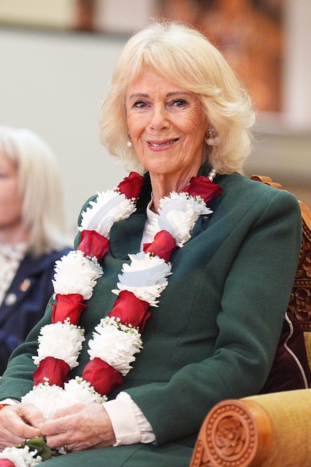 Queen Camilla smiles as her and King Charles III are greeted by children from the community, during a visit to BAPS Shri Swaminarayan Mandir (known as the 'Neasden Temple') in Neasden, London. They will observe spiritual ceremonies, meet representatives from community and social impact initiatives the temple works with, before meeting members of the congregation. Picture date: Wednesday October 29, 2025., Credit:Aaron Chown / Avalon
