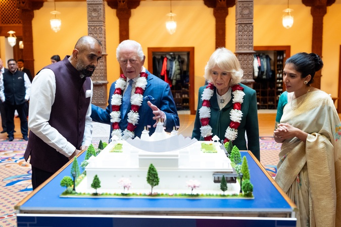 King Charles III and Queen Camilla view a model of a new temple to be built in Paris, during a visit to BAPS Shri Swaminarayan Mandir (known as the 'Neasden Temple') in Neasden, London. They will observe spiritual ceremonies, meet representatives from community and social impact initiatives the temple works with, before meeting members of the congregation.Picture date: Wednesday October 29, 2025., Credit:Aaron Chown / Avalon