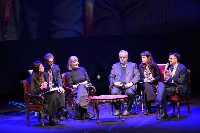 Lucca Comics & Games 2025 inauguration with institutions, artists, and a large audience. On stage, Rébecca Dautremer, author of the Lucca Comics & Games 2025 poster, along with presenter Marta Perego and director Luc Besson, a master of European and international cinema on Spet 29th 2025, Credit:Stefano Dalle Luche / Avalon