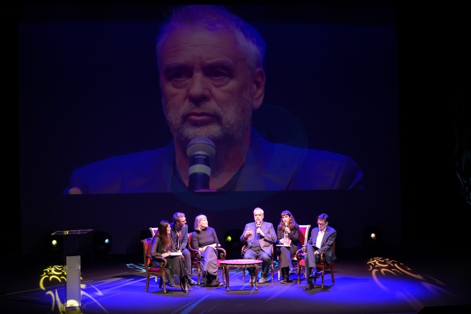 Lucca Comics & Games 2025 inauguration with institutions, artists, and a large audience. On stage, Rébecca Dautremer, author of the Lucca Comics & Games 2025 poster, along with presenter Marta Perego and director Luc Besson, a master of European and international cinema on Spet 29th 2025, Credit:Stefano Dalle Luche / Avalon