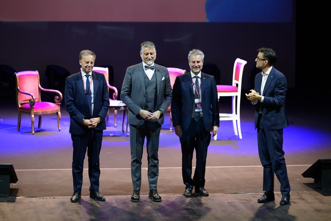 Lucca Comics & Games 2025 inauguration with dignitaries, artists, and a large audience. On stage were Minister of Culture Alessandro Giuli,French Ambassador to Italy Martin Briens, Mayor of Lucca Mario Pardini, and Emanuele Vietina, Director of Lucca Comics & Games on Spet 29th 2025, Credit:Stefano Dalle Luche / Avalon