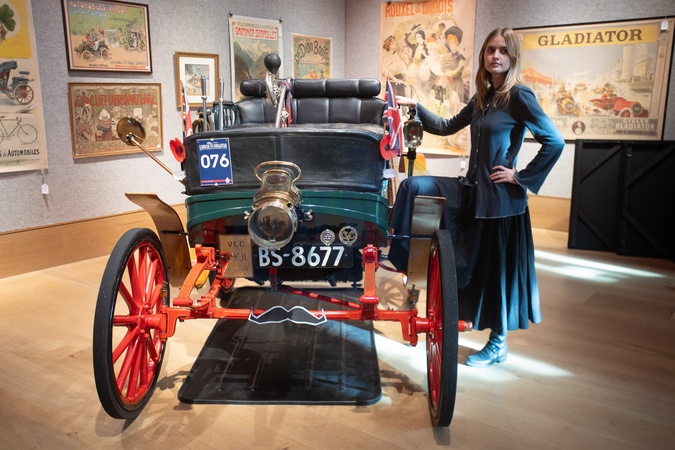 A staff member poses with a '1901 Albion Model A1 8hp Twin-Cylinder Dog Cart' (est. £150k - £170k) which is on auction at Bonhams' Golden Age Of Motoring Sale on 31st October 2025 - Bonhams, London, England, UK on Thursday 30 October, 2025., Credit:Justin Ng / Avalon