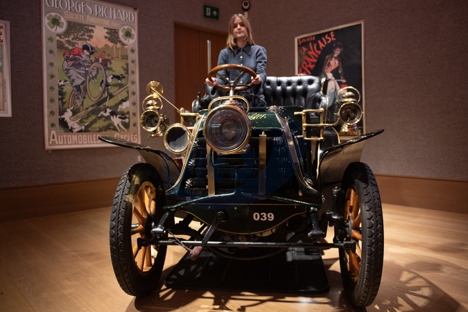 A staff member poses with a '1902 Panhard et Levassor 7hp Twin-cylinder Rear-entrance Tonneau' (est. £250k - £350k) which is on auction at Bonhams' Golden Age Of Motoring Sale on 31st October 2025 - Bonhams, London, England, UK on Thursday 30 October, 2025., Credit:Justin Ng / Avalon