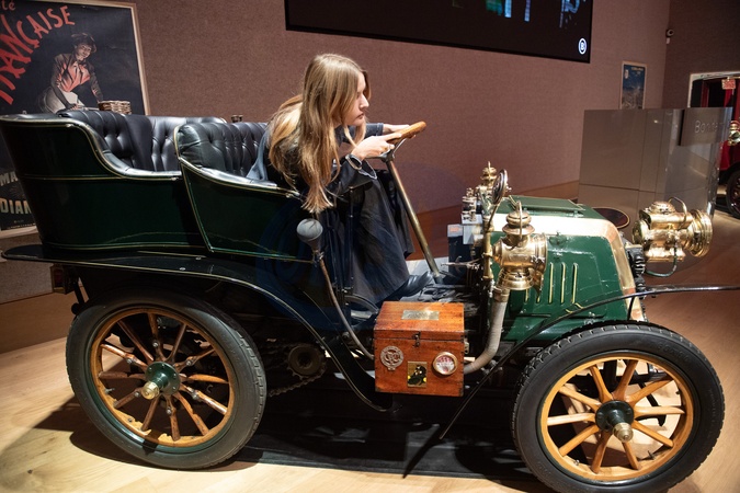 A staff member poses with a '1902 Panhard et Levassor 7hp Twin-cylinder Rear-entrance Tonneau' (est. £250k - £350k) which is on auction at Bonhams' Golden Age Of Motoring Sale on 31st October 2025 - Bonhams, London, England, UK on Thursday 30 October, 2025., Credit:Justin Ng / Avalon