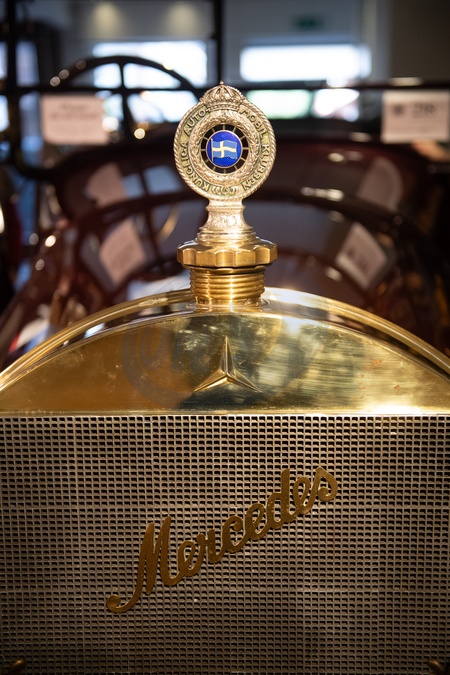 A staff member poses with a '1915 Mercedes 22/50hp Open Tourer' (est. £250k - £350k) which is on auction at Bonhams' Golden Age Of Motoring Sale on 31st October 2025 - Bonhams, London, England, UK on Thursday 30 October, 2025., Credit:Justin Ng / Avalon