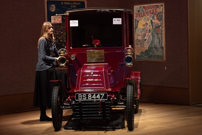 A staff member poses with a '1903 Georges Richard Type H 10hp Twin-cylinder Two-seater Brougham' (est. £100k - £120k) which is on auction at Bonhams' Golden Age Of Motoring Sale on 31st October 2025 - Bonhams, London, England, UK on Thursday 30 October, 2025., Credit:Justin Ng / Avalon
