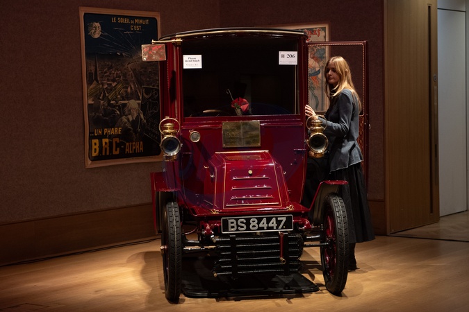 A staff member poses with a '1903 Georges Richard Type H 10hp Twin-cylinder Two-seater Brougham' (est. £100k - £120k) which is on auction at Bonhams' Golden Age Of Motoring Sale on 31st October 2025 - Bonhams, London, England, UK on Thursday 30 October, 2025., Credit:Justin Ng / Avalon