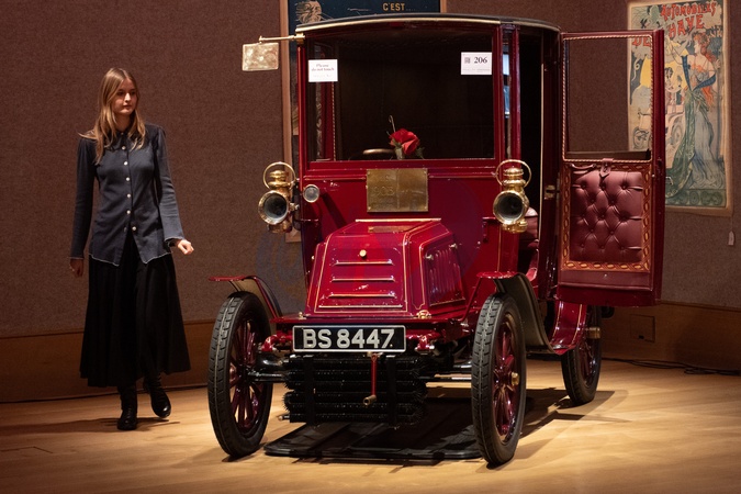 A staff member poses with a '1903 Georges Richard Type H 10hp Twin-cylinder Two-seater Brougham' (est. £100k - £120k) which is on auction at Bonhams' Golden Age Of Motoring Sale on 31st October 2025 - Bonhams, London, England, UK on Thursday 30 October, 2025., Credit:Justin Ng / Avalon