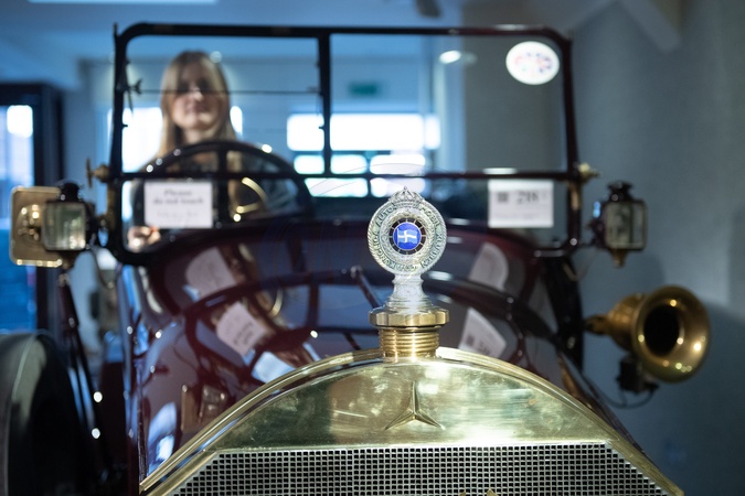 A staff member poses with a '1915 Mercedes 22/50hp Open Tourer' (est. £250k - £350k) which is on auction at Bonhams' Golden Age Of Motoring Sale on 31st October 2025 - Bonhams, London, England, UK on Thursday 30 October, 2025., Credit:Justin Ng / Avalon