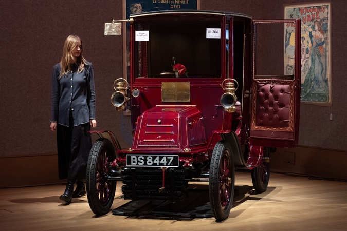 A staff member poses with a '1903 Georges Richard Type H 10hp Twin-cylinder Two-seater Brougham' (est. £100k - £120k) which is on auction at Bonhams' Golden Age Of Motoring Sale on 31st October 2025 - Bonhams, London, England, UK on Thursday 30 October, 2025., Credit:Justin Ng / Avalon