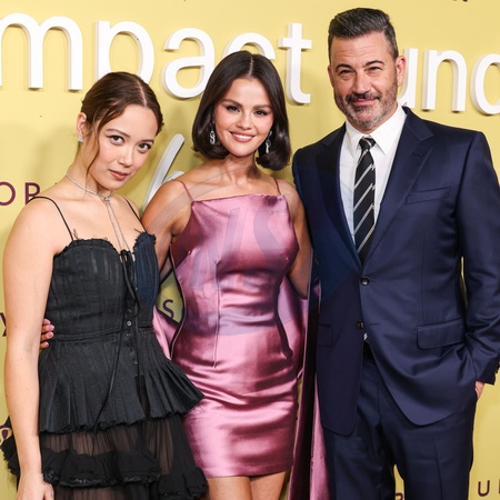 HOLLYWOOD, LOS ANGELES, CALIFORNIA, USA - OCTOBER 29: Laufey, Selena Gomez and Jimmy Kimmel arrive at the 3rd Annual Rare Impact Fund Benefit 2025 hosted by Selena Gomez held at nya studios WEST on October 29, 2025 in Hollywood, Los Angeles, California, United States., Credit:Xavier Collin / Avalon