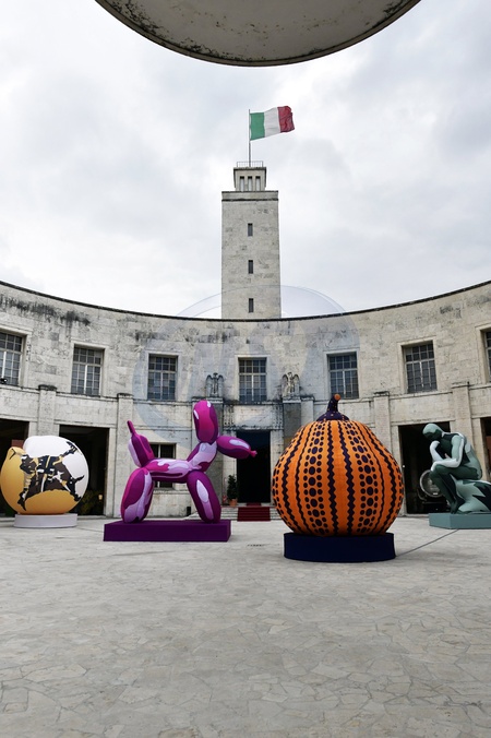 The Museo del Genio (Historical and Cultural Institute of the Italian Army's Engineer Corps) offers itself as a new cultural venue in the capital. View POP AIR. Ugo Nespolo presents eight enormous inflatable sculptures in the museum courtyard, each reproducing famous works by renowned artists: Venus de Milo, 2nd century BC; The Thinker by Auguste Rodin, 1902; Maman by Louise Bourgeois, 1999; Sphere within a Sphere by Arnaldo Pomodoro, 1991; Paloma by Fernando Botero, 1990; Head by Amedeo Modigliani, 1912; Balloon Dog by Jeff Koons, 2000; and Yellow Pumpkin by Yayoi Kusama, 1994. Rome, 30th of October 2025, Credit:Mimmo Frassineti / Avalon