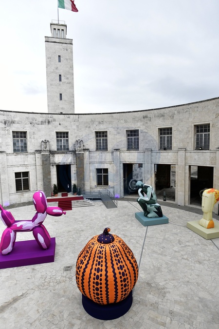 The Museo del Genio (Historical and Cultural Institute of the Italian Army's Engineer Corps) offers itself as a new cultural venue in the capital. View POP AIR. Ugo Nespolo presents eight enormous inflatable sculptures in the museum courtyard, each reproducing famous works by renowned artists: Venus de Milo, 2nd century BC; The Thinker by Auguste Rodin, 1902; Maman by Louise Bourgeois, 1999; Sphere within a Sphere by Arnaldo Pomodoro, 1991; Paloma by Fernando Botero, 1990; Head by Amedeo Modigliani, 1912; Balloon Dog by Jeff Koons, 2000; and Yellow Pumpkin by Yayoi Kusama, 1994. Rome, 30th of October 2025, Credit:Mimmo Frassineti / Avalon