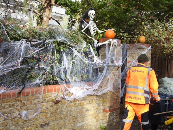 Houses in Kensington have decorations for Halloween and street sweepers and residents walk past the buildings and take photos, Credit:Alexander Seale / Avalon