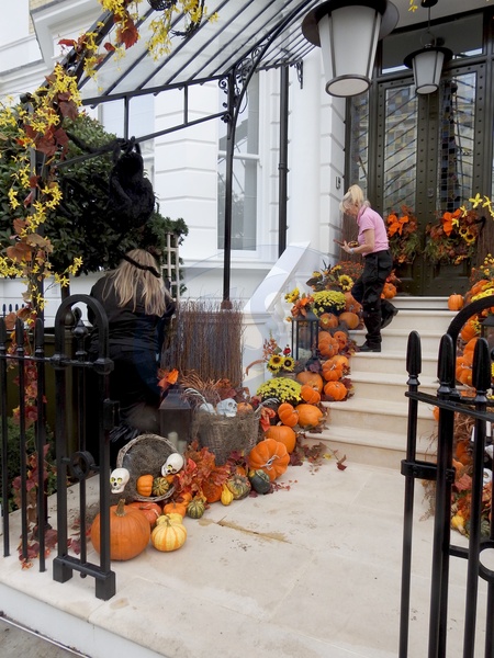 Two women making finishing touches in front of a house in Kensington for Halloween, Credit:Alexander Seale / Avalon