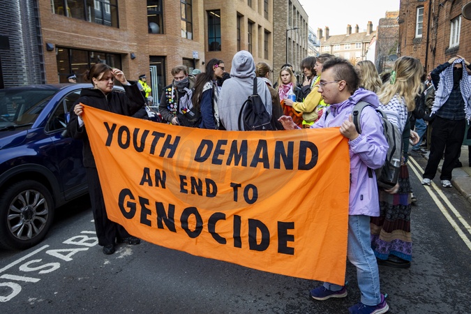 Youth Demand activists gathered outside the Labour Party's headquarters in Central London to protest against the government's stance on Palestine, as well as its domestic policies on housing and climate change. Demonstrators held banners and signs calling for an end to what they described as political inaction and hypocrisy, urging the Labour government to take meaningful steps toward justice and sustainability., Credit:Zak Irfan / Avalon