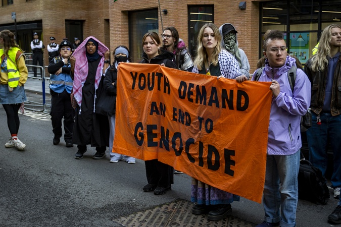 Youth Demand activists gathered outside the Labour Party's headquarters in Central London to protest against the government's stance on Palestine, as well as its domestic policies on housing and climate change. Demonstrators held banners and signs calling for an end to what they described as political inaction and hypocrisy, urging the Labour government to take meaningful steps toward justice and sustainability., Credit:Zak Irfan / Avalon