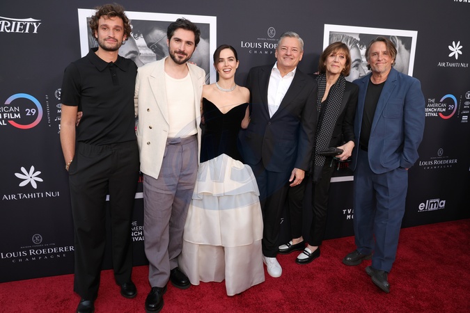 30 October 2025 . Los Angeles, California - Aubry Dullin, Guillaume Marbeck, Zoey Deutch, Ted Sarandos, Michèle Halberstadt, Richard Linklater At 2025 American French Film Festival: Los Angeles Premiere Of Netflix's "Nouvelle Vague" held at DGA Theater in Los Angeles., Credit:Sadou Faye / Avalon