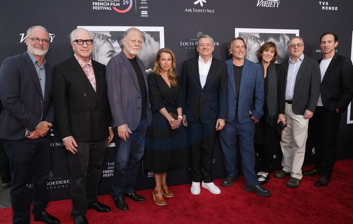 30 October 2025 . Los Angeles, California - Louis Hallonet, Howard A. Rodman, Dante Harper, Richard Linklater, Taylor Hackford, Cécile Rap-Veber, Ted Sarandos, Russell Hollander, Michèle Pétin At 2025 American French Film Festival: Los Angeles Premiere Of Netflix's "Nouvelle Vague" held at DGA Theater in Los Angeles., Credit:Sadou Faye / Avalon
