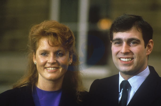 Prince Andrew, Duke of York with Sarah Ferguson after their engagement announcement, Buckingham Palace, London, 17th March 1986., Credit:John Shelley Collection / Avalon
