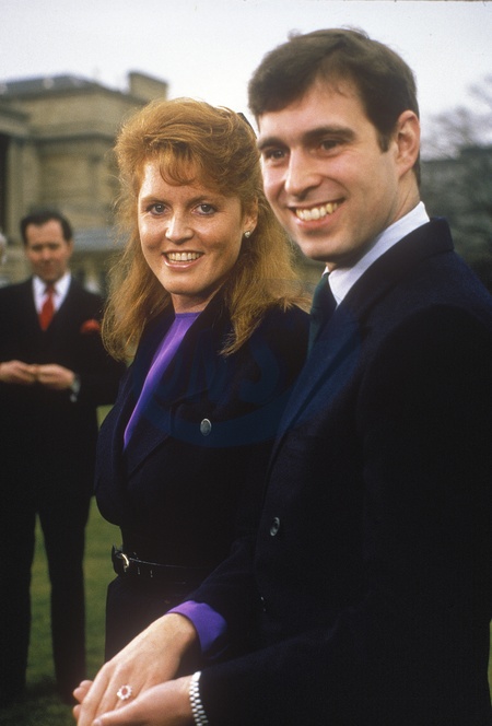 Prince Andrew, Duke of York with Sarah Ferguson after their engagement announcement, Buckingham Palace, London, 17th March 1986., Credit:John Shelley Collection / Avalon