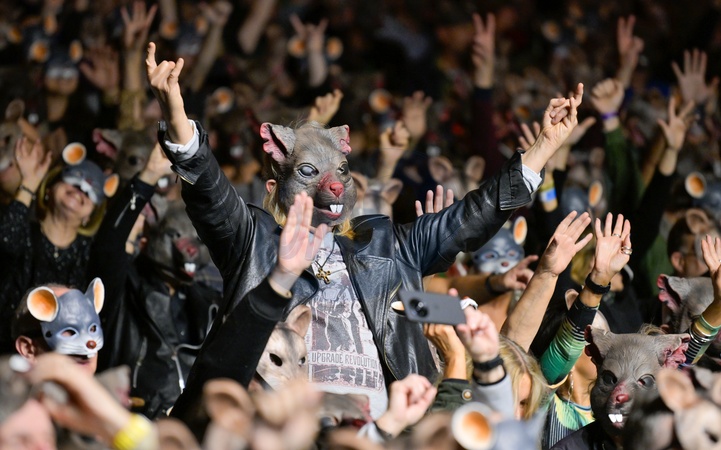 Atmosphere at The Boomtown Rats celebrate their 50th Anniversary since their first gig., The audience were all given Rat masks to wear for the show, Credit:Jules Annan / Avalon
