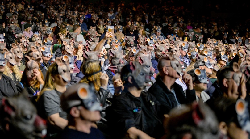Atmosphere at The Boomtown Rats celebrate their 50th Anniversary since their first gig., The audience were all given Rat masks to wear for the show, Credit:Jules Annan / Avalon