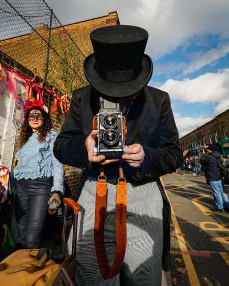 London, UK. 01st Nov, 2025. A photographer captures some of the scenes with a beautiful old Mamyaflex camera. Participants in their lavish costumes mingle and get ready, then parade around Columbia Road. Columbia Road comes alive to celebrate London's Day of the Dead, a traditional Mexican festival joyfully honouring the departed., Credit:Imageplotter / Avalon