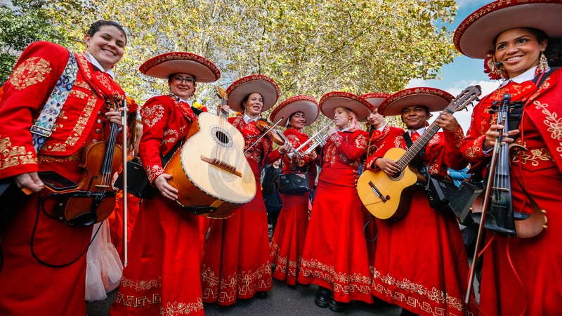 London, UK. 01st Nov, 2025. A mexican all-female band plays at the start of the parade. Participants in their lavish costumes mingle and get ready, then parade around Columbia Road. Columbia Road comes alive to celebrate London's Day of the Dead, a traditional Mexican festival joyfully honouring the departed., Credit:Imageplotter / Avalon