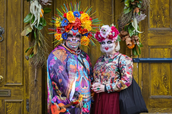 London, UK. 01st Nov, 2025. Two participants pose ahead of the parade. Participants in their lavish costumes mingle and get ready, then parade around Columbia Road. Columbia Road comes alive to celebrate London's Day of the Dead, a traditional Mexican festival joyfully honouring the departed., Credit:Imageplotter / Avalon