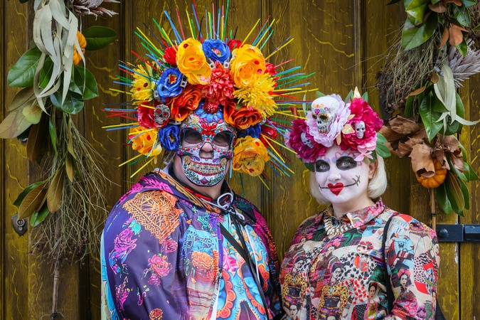 London, UK. 01st Nov, 2025. Two participants pose ahead of the parade. Participants in their lavish costumes mingle and get ready, then parade around Columbia Road. Columbia Road comes alive to celebrate London's Day of the Dead, a traditional Mexican festival joyfully honouring the departed., Credit:Imageplotter / Avalon
