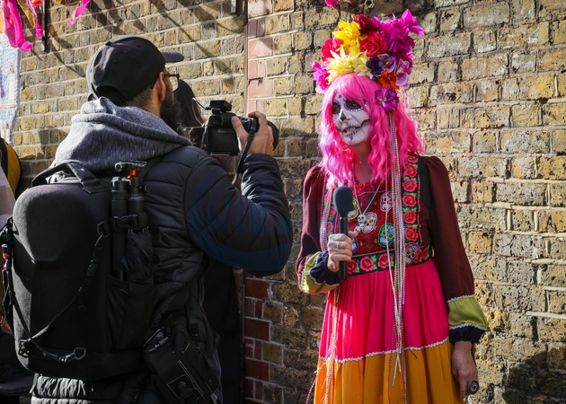 London, UK. 01st Nov, 2025. Even reporters and bloggers seem to get in with the theme. Participants in their lavish costumes mingle and get ready, then parade around Columbia Road. Columbia Road comes alive to celebrate London's Day of the Dead, a traditional Mexican festival joyfully honouring the departed., Credit:Imageplotter / Avalon