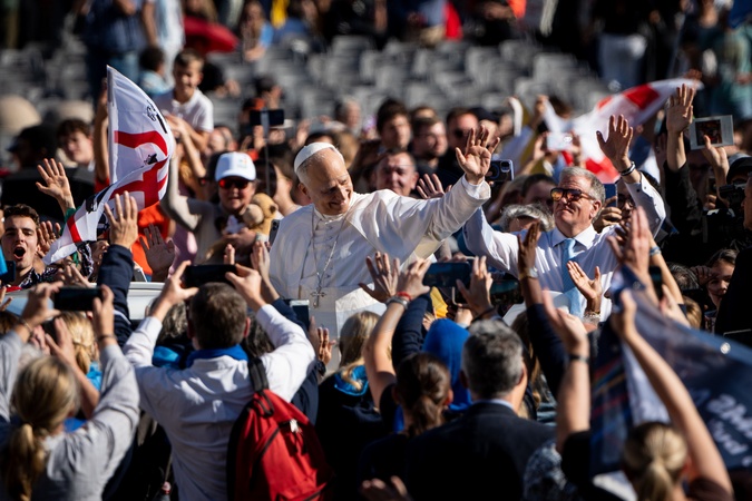 Pope Leo XIV presides over Mass with participants in the Jubilee of the World of Education on the Solemnity of All Saints, in St. Peter's Square in Vatican City, Vatican, on 01 November 2025.