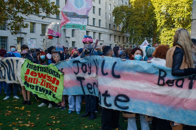 Demonstrators from various transgender rights groups under the "ANTIFA" banner counter protest the "No Men In Women's Prisons" march, London, UK, 1 November 2025, Credit:Alex Day / Avalon