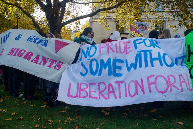 Demonstrators from various transgender rights groups under the "ANTIFA" banner counter protest the "No Men In Women's Prisons" march, London, UK, 1 November 2025, Credit:Alex Day / Avalon