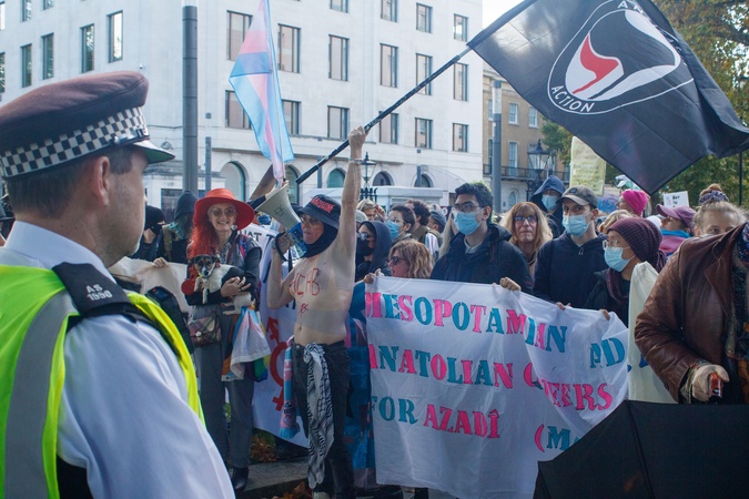 Demonstrators from various transgender rights groups under the "ANTIFA" banner counter protest the "No Men In Women's Prisons" march, London, UK, 1 November 2025, Credit:Alex Day / Avalon