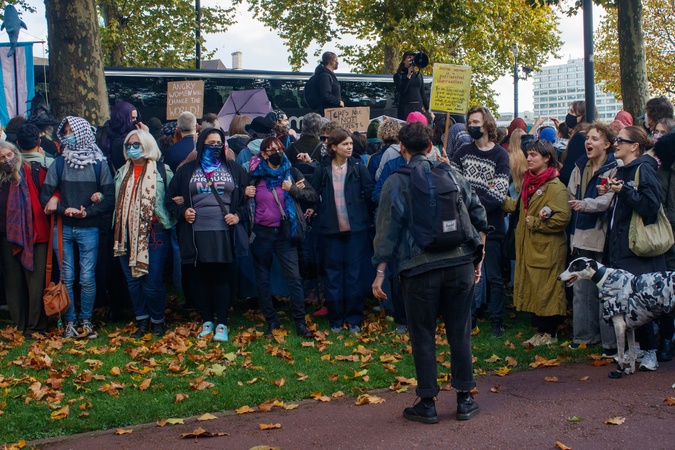 Demonstrators from various transgender rights groups under the "ANTIFA" banner counter protest the "No Men In Women's Prisons" march, London, UK, 1 November 2025, Credit:Alex Day / Avalon