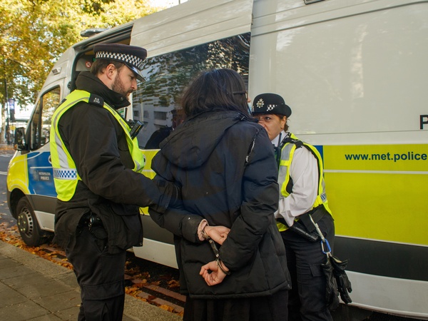 A protester from one of many transgender rights groups counter protesting the "No Men In Women's Prisons" march getting arrested, London, UK, 1 November 2025, Credit:Alex Day / Avalon