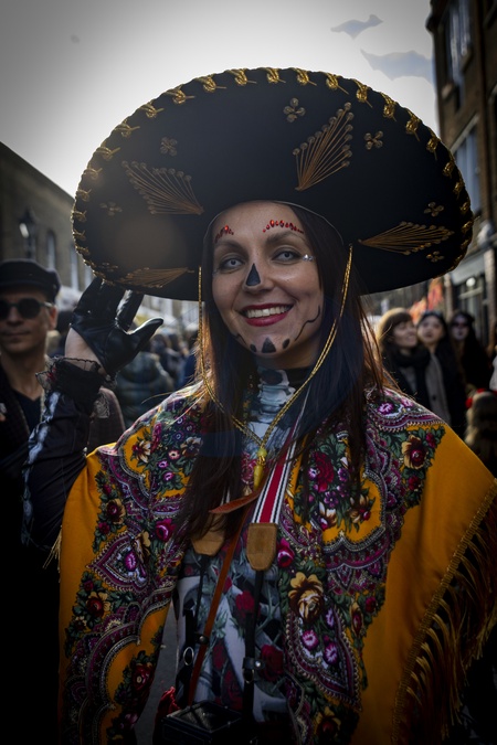 The Day of the Dead celebration took place at Columbia Road Flower Market in East London, with vibrant processions winding through the market's stalls. The event featured altars, floral displays and traditional music as locals and visitors gathered to honour ancestors and celebrate heritage amid the iconic flower market setting., Credit:Zak Irfan / Avalon