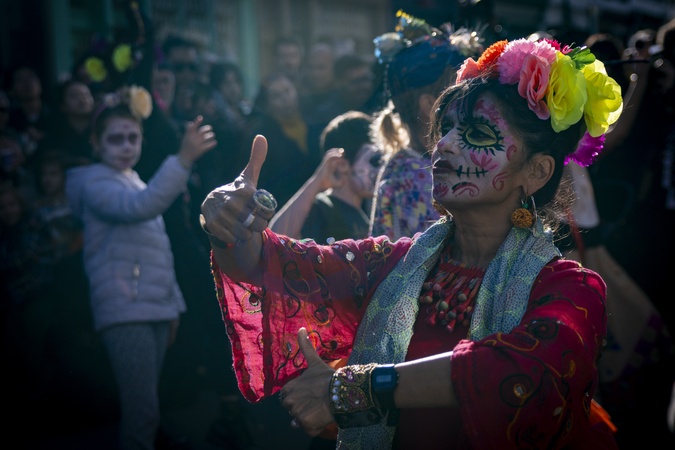 The Day of the Dead celebration took place at Columbia Road Flower Market in East London, with vibrant processions winding through the market's stalls. The event featured altars, floral displays and traditional music as locals and visitors gathered to honour ancestors and celebrate heritage amid the iconic flower market setting., Credit:Zak Irfan / Avalon